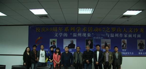 副院长孙良好教授主持,出席的嘉宾有国家一级作家、浙江省作协副主席、温州市文联主席与作协主席王手,“原散文”代表作家、浙江省散文创委会副主任、温州市作协副主席马叙,“中生代”代表诗人、首届《十月》诗歌奖获得者池凌云,在音乐与文学中自由穿梭并教授英语的作家郑亚洪,首届《人民文学》新人奖获得者、温州市作协副主席哲贵,第二届郁达夫短篇小说奖获得者、温州市作协副主席东君,财神捕鱼