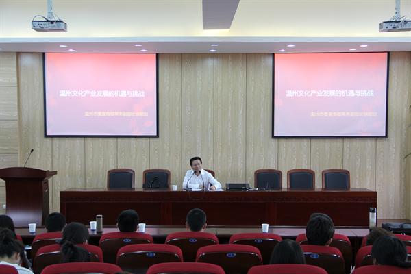 师生开设了题为“温州文化产业发展的机遇与挑战”专题讲座。院长蔡贻象教授以及广告学、中文专业的部分教师和本科生参加了此次讲座。