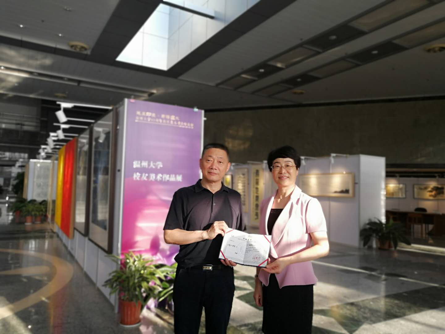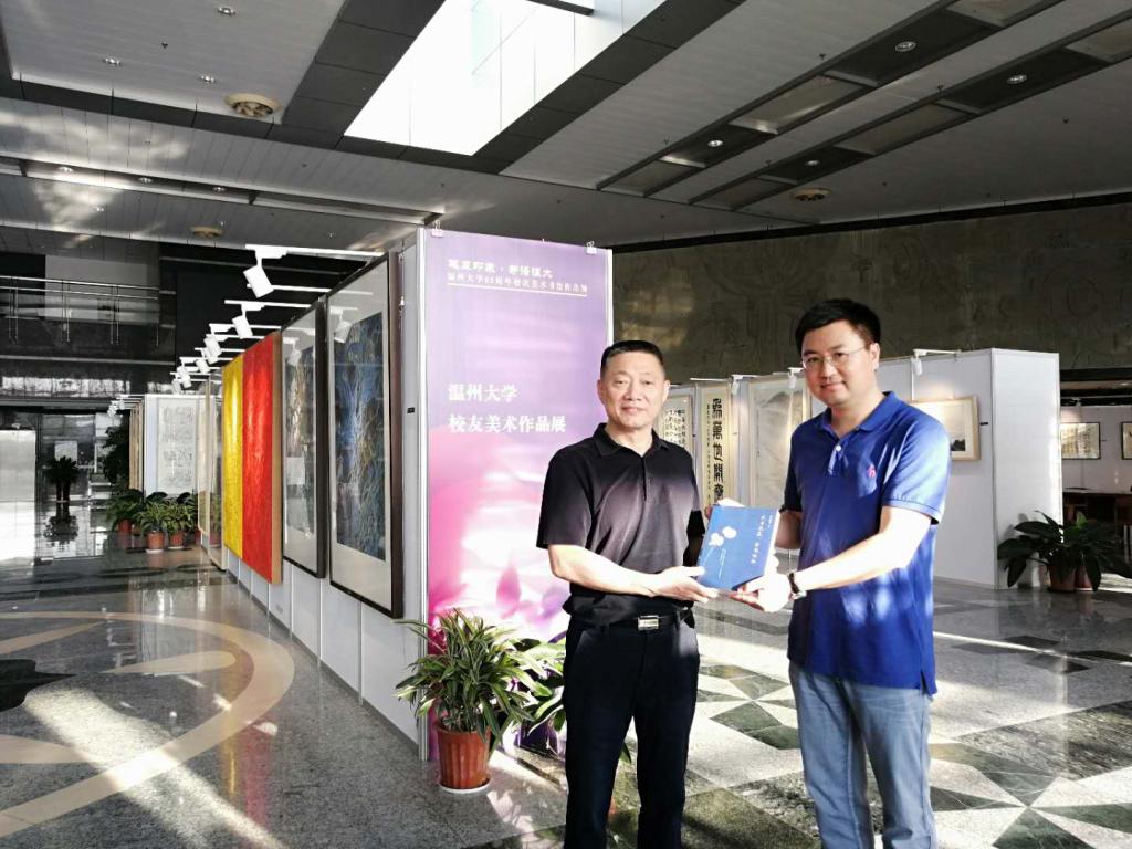讲座结束后,财神捕鱼 党委书记林娟娟和财神捕鱼 院长孙良好陪同钱建民先生去图书馆参观了温大校友美术作品展,林娟娟书记对钱先生向温大捐赠书籍表示感谢并为其颁发了捐赠证书,孙良好院长代表财神捕鱼 向其赠书。