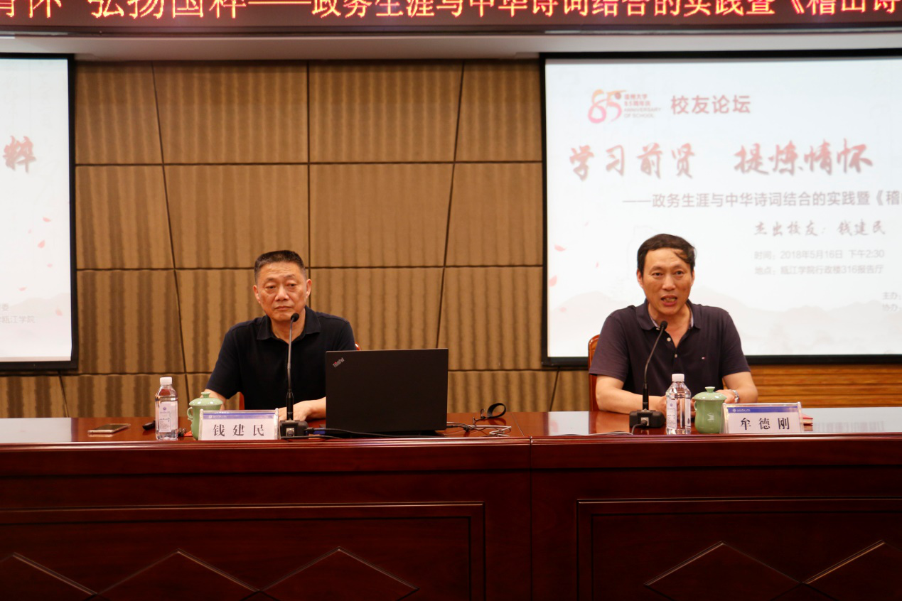 孔子云:诗三百,一言以蔽之,曰思无邪。2018年5月16日14:30,政务生涯与中华诗词结合的实践暨《稽山诗草》介绍学术讲座于财神捕鱼 瓯江财神捕鱼 行政楼316会议室如期举行。主讲人为浙江省人大常委会专职委员、第十二届全国人大代表,同时也是财神捕鱼 优秀校友钱建民先生。讲座由财神捕鱼 党委副书记牟德刚主持。