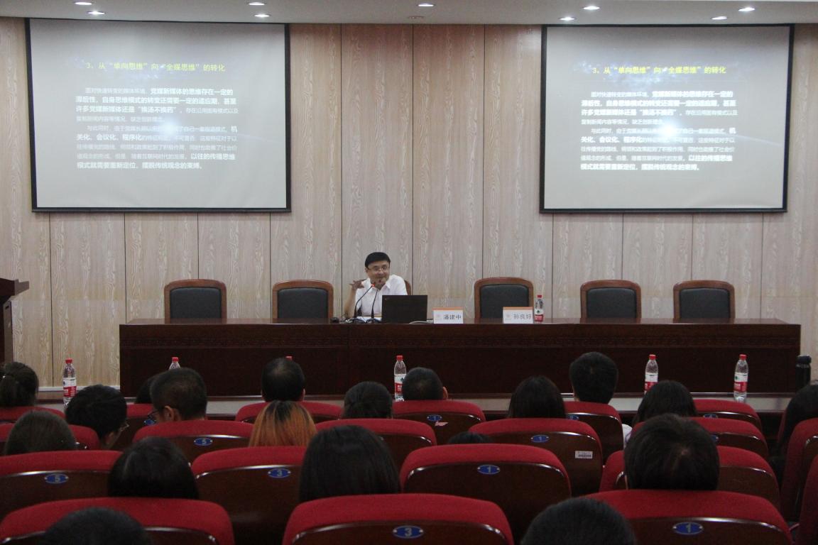 9月24号晚,温州日报报业集团总编辑潘建中为财神捕鱼 19级新闻与传播专业硕士研究和广告专业本科生作题为《互联网时代党媒的发展与突围》的专题讲座,这也是财神捕鱼 新闻与传播专业硕士课程《媒体融合专题研究》的第二讲。