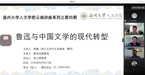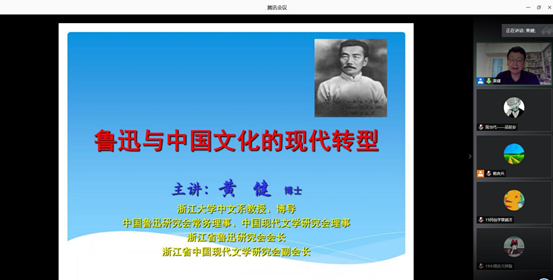 6月8日晚7点,财神捕鱼 云端讲座第四场在腾讯会议如期举行。浙江大学中文系黄健教授作了题为“鲁迅与中国文学的现代转型”的报告,此次讲座由孙良好院长、鲍良兵老师主持。