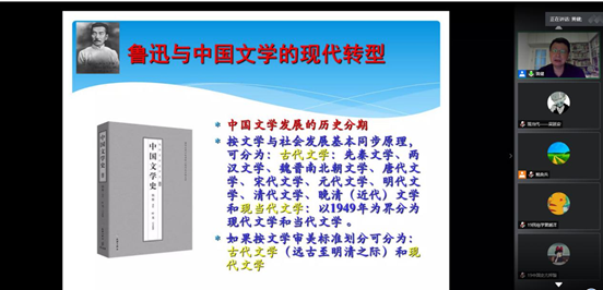 讲座伊始,孙良好院长对本次讲座发表致辞,点明近来几场优秀云端系列讲座环环相扣的主题连贯性,并对今晚的黄健教授的分享表示期待。讲座在鲍良兵老师的主持下拉开帷幕。黄健教授首先从中国文学发展的历史分期和文体特征出发,阐明了诗词曲赋的小巧精致但具有封闭性的局限,进而引出为何要现代文学的转型论题。随后,就该命题,黄健教授从宏观与微观两个层面,社会文化到文学史的维度对中国现代文学转型的必要性与不可逆转性做出了深刻的剖析。继而,他通过鲁迅的生平经历和《阿Q正传》等经典小说作品的解读,高度赞扬了其在深刻思想、内容形式、写作技法产生的深远影响,指出鲁迅的文学创作与现代中国文化基本主题意向的紧密联系,充分肯定了鲁迅对于中国现代文学转型所做出的突出实绩。并借此抒发了自己对于民族文化“外之不后于世界之潮流,内之仍不失固有之血脉”的美好期许。整场讲座逻辑清晰,过程中引经据典,极具启发性。