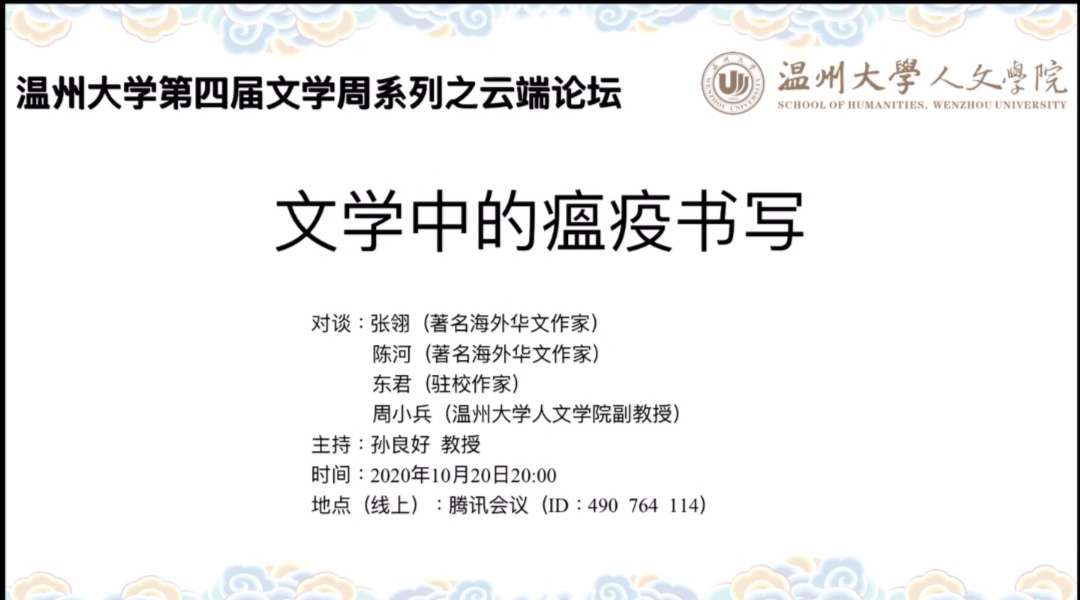 2020年10月20日20:00,财神捕鱼 云端论坛系列第六期《文学中的瘟疫书写》准时在腾讯会议展开,本次云端论坛受邀嘉宾分别是旅居加拿大的知名华人作家张翎、陈河,以及温州市作家协会副主席东君和财神捕鱼 副教授周小兵。本次云端论坛由孙良好院长主持,现当代文学专业的研究生和部分本科生参加了本次云端论坛。