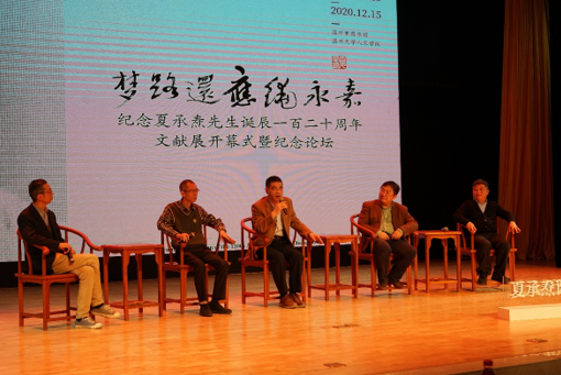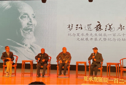 在一小段夏承焘先生所作诗词的朗诵表演后,活动进入第三个段落。纪念论坛的上半场,由《温州人》杂志副主编方韶毅主持,邀请曾亲炙于夏承焘先生的陈增杰、沈洪保、包文朴上台交流。陈增杰先生细述其登门拜访并受业于夏承焘先生的往事,并举夏先生推荐并关心其著作出版的一件小事,以观夏先生对后学的古道热忱和殷殷关切。沈洪保先生因曾求学于杭州大学,聆听过夏承焘先生的讲课,对夏先生金针度人的诸多教诲记忆深刻,故通过他对交往点滴的回顾,夏先生的音容笑貌,如在眼前。包文朴先生则追述了夏承焘先生1962年在温州师院讲学时吟诵宋词的场景,并根据当年的实录曲谱现场以温州话吟诵了《声声慢》《念奴娇·赤壁怀古》等宋词名篇,以此缅怀师恩。三位老先生鲜活生动的回忆,再现了夏承焘先生为人师的人格风范。