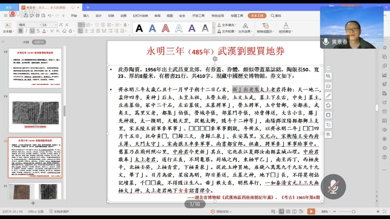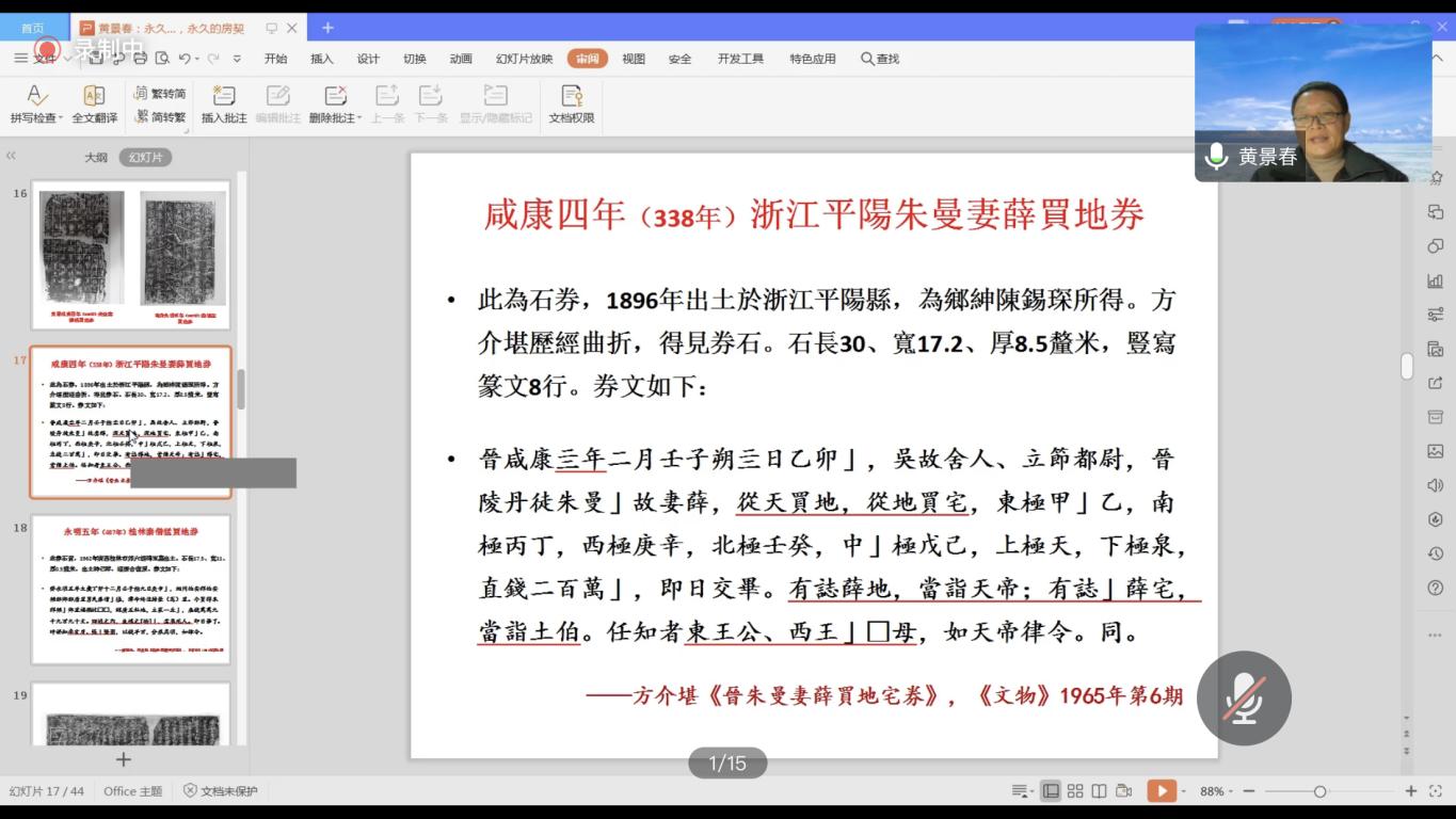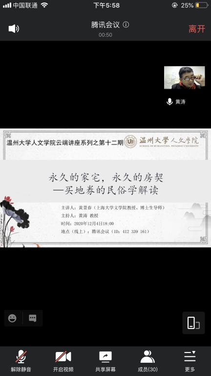 2020年12月4日晚,上海大学黄景春教授受邀于线上为财神捕鱼 师生作了题为“永远的家宅,永远的房契——买地券的民俗学解读” 的学术讲座,此次讲座由财神捕鱼 黄涛教授主持,万军老师、王辉老师出席,民俗学等专业研究生积极参与。