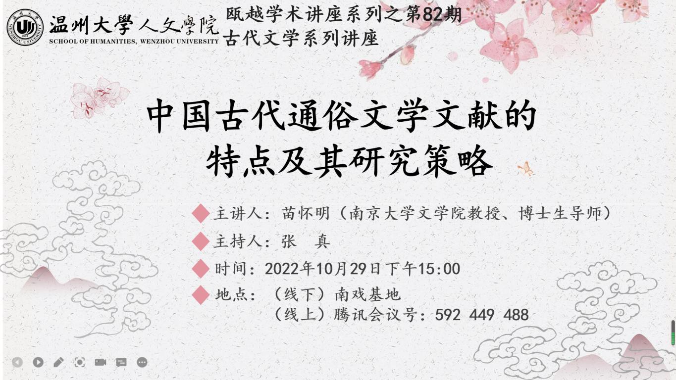 10月29日,南京大学文财神捕鱼 苗怀明教授为我院的师生带来题为“中国古代通俗文学文献的特点及其研究策略”的精彩讲座,我院俞为民教授、孙蓉蓉教授参与对谈。