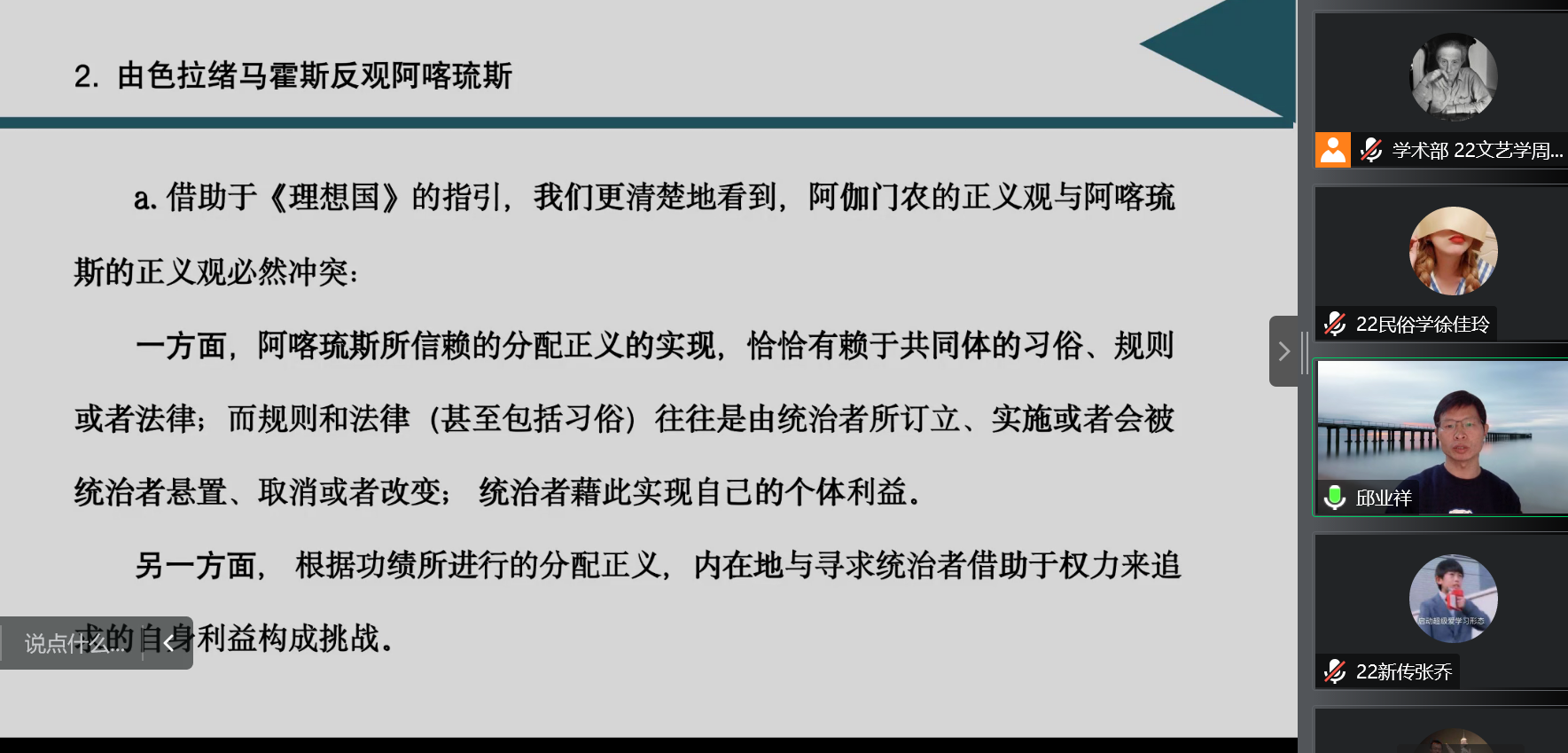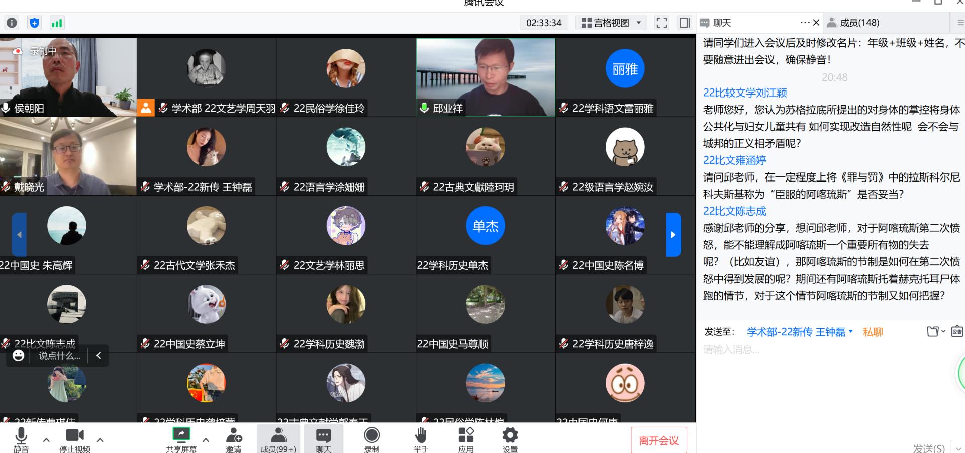 2022年11月4日19点,河南大学文财神捕鱼 教授、博士生导师邱业祥老师受邀为财神捕鱼 师生带来了一场题为“苏格拉底论阿喀琉斯——以《理想国》为中心”的精彩讲座。讲座由侯朝阳老师主持,中国人民大学文财神捕鱼 青年教师戴晓光博士参与对谈。