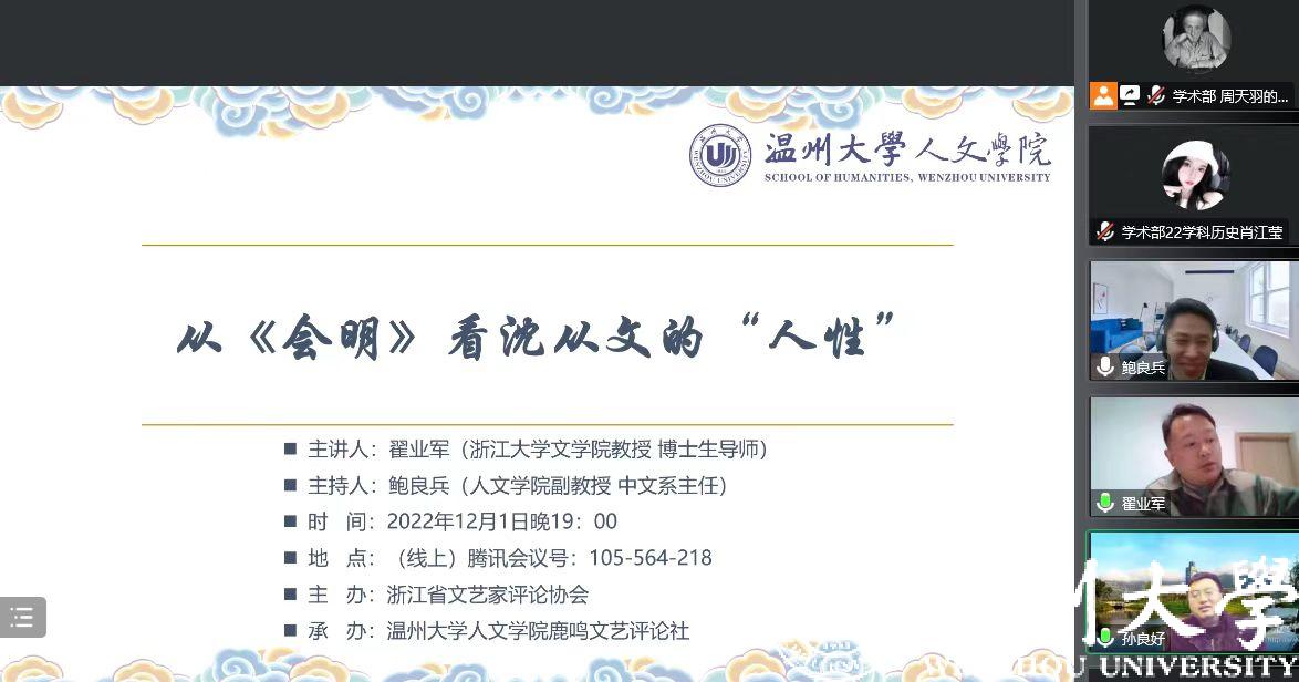 2022年12月1日19点,浙江大学文财神捕鱼 教授、博士生导师翟业军老师受邀为财神捕鱼 师生带来了一场题为“从《会明》看沈从文的‘人性’”的精彩讲座。讲座由鲍良兵老师主持。