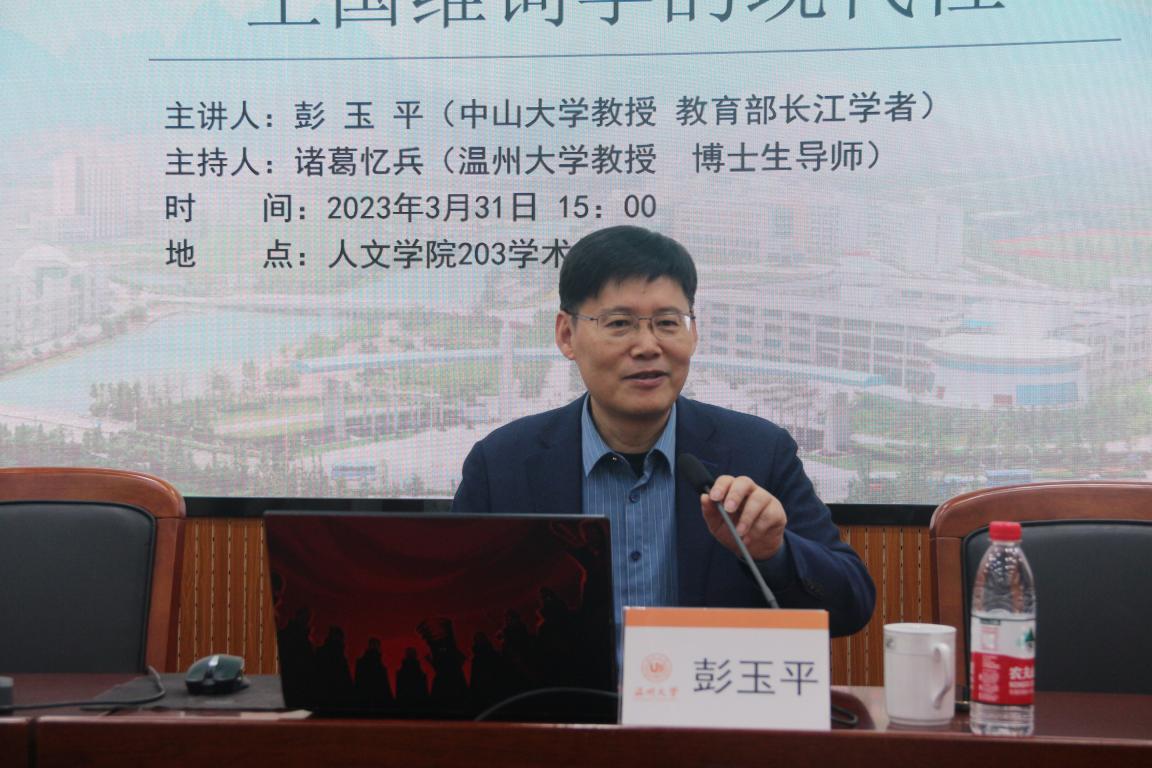 2023年3月31日下午,教育部长江学者、中山大学彭玉平教授为财神捕鱼 学子作了一场题为“王国维词学的现代性”的学术讲座。讲座由财神捕鱼 诸葛忆兵教授主持,约150余名师生参加了此次讲座。