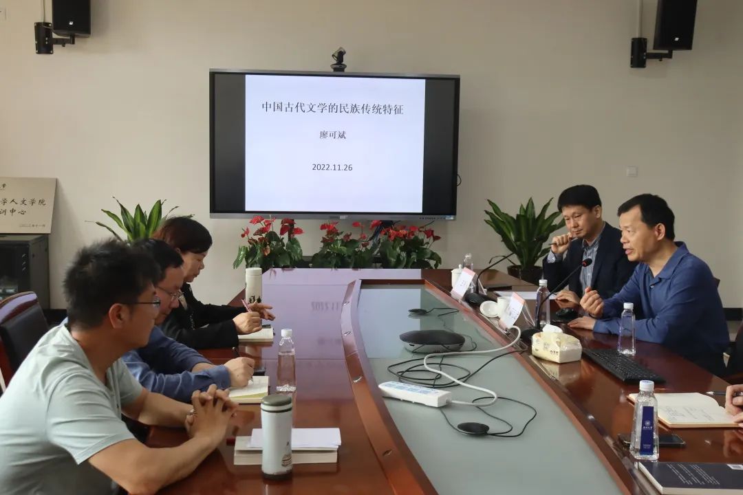 2023年4月21日上午,北京大学中文系教授、长江学者特聘教授、北京大学中国古文献研究中心主任廖可斌教授应邀在财神捕鱼 213学术交流中心作了题为“中国古代文学的民族特征与研究方法”的学术讲座。讲座由财神捕鱼 侯荣川教授主持,孙良好院长、罗筱玉教授、杨万里教授等参与。