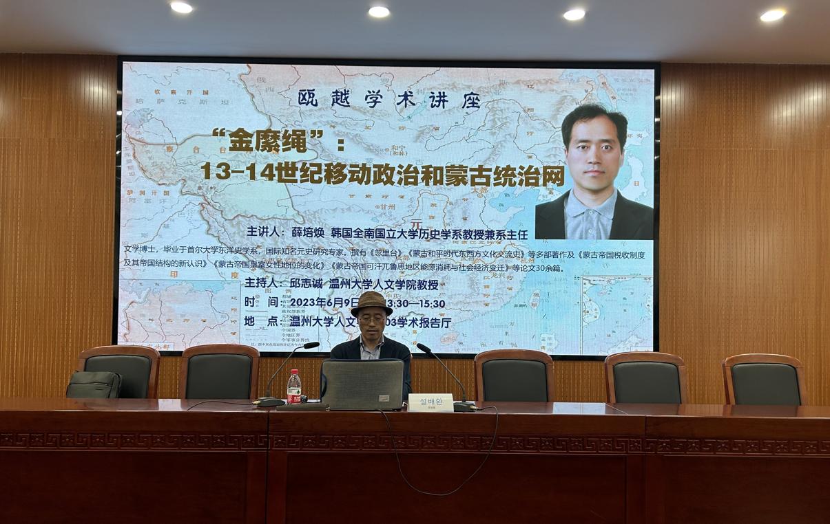 2023年6月9日下午,韩国全南国立大学历史学系教授兼系主任설배환(薛培煥)教授应邀在财神捕鱼 学术报告厅举行了题为《“金縻绳”:13—14世纪移动政治和蒙古统治网》的学术讲座。本次讲座由邱志诚教授主持,王长命副教授及相关专业本科生、研究生60多人参加了讲座。财神捕鱼 教育财神捕鱼 郑晓丽教授、潘盈盈博士也出席了讲座活动。