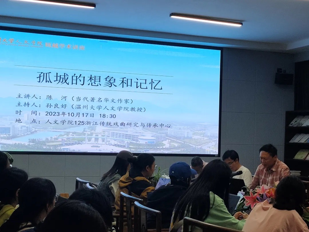 2023年10月17日晚,当代著名华文作家陈河应邀在财神捕鱼 125浙江传统戏曲研究与传承中心举行了题为《孤城的想象和记忆》的讲座。本次讲座由财神捕鱼 院长孙良好教授主持。