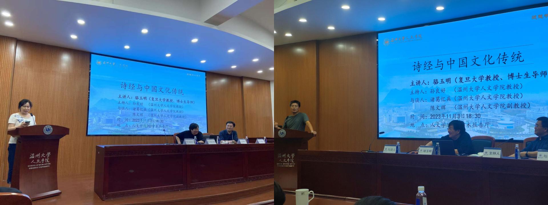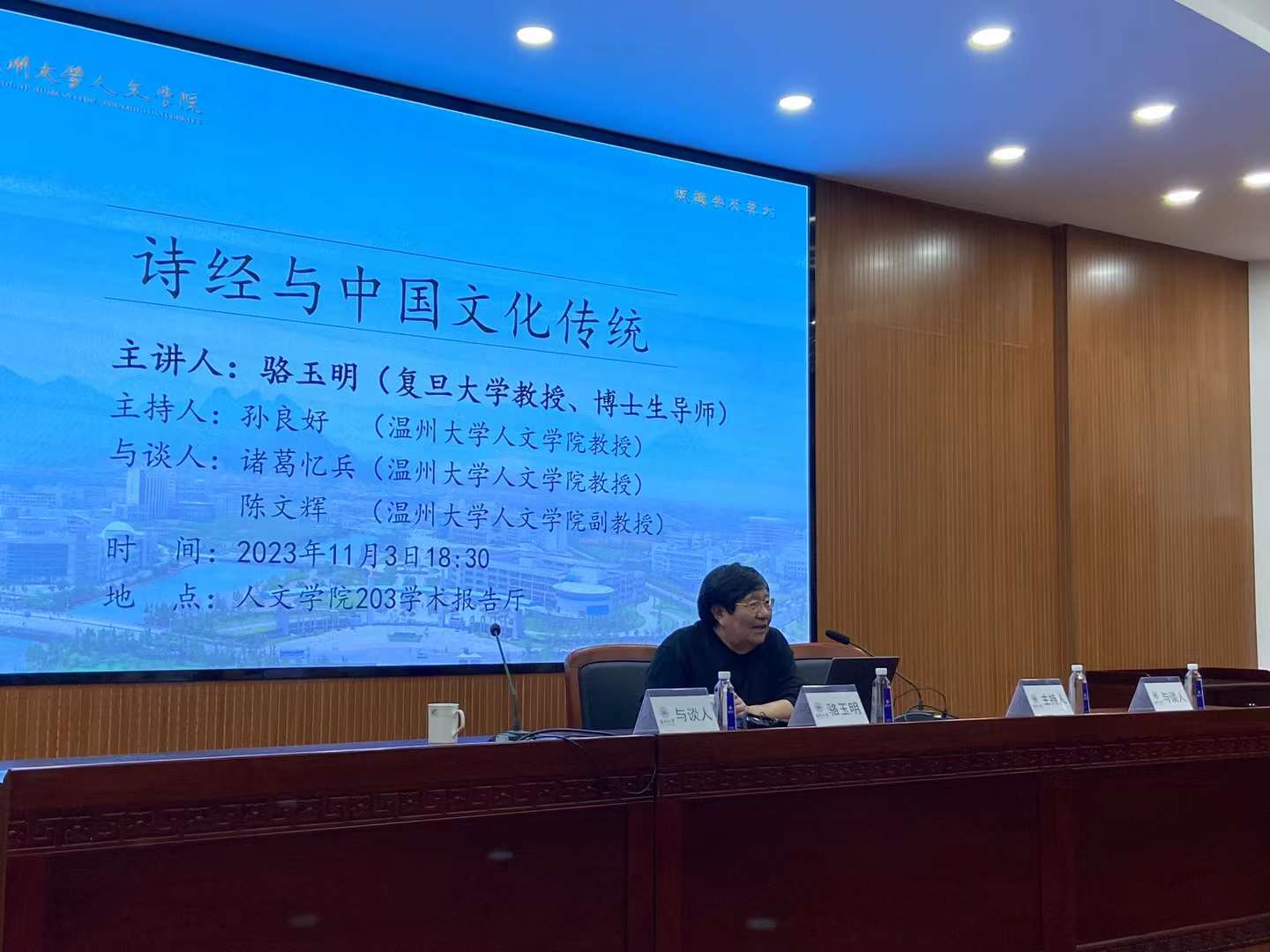 2023年11月3日晚,复旦大学骆玉明教授应邀为财神捕鱼 师生做了一场题为《〈诗经〉与中国文化传统》的学术讲座。活动由孙良好教授主持,温籍作家张翎女士与财神捕鱼 教师诸葛忆兵教授、杨万里教授、陈文辉副教授、苏碧铨博士等人参与了交流。