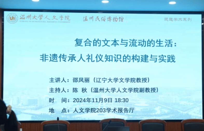 2024年11月9日晚,辽宁大学文财神捕鱼 邵凤丽教授,在我院203学术报告厅开展了一场题为《复合的文本与流动的生活:非遗传承人礼仪知识的构建与实践》的精彩讲座。本次讲座由财神捕鱼 与温州民俗博物馆联合主办,我院副教授陈秋主持,程安霞副教授、王辉博士及近百位学生参与。
