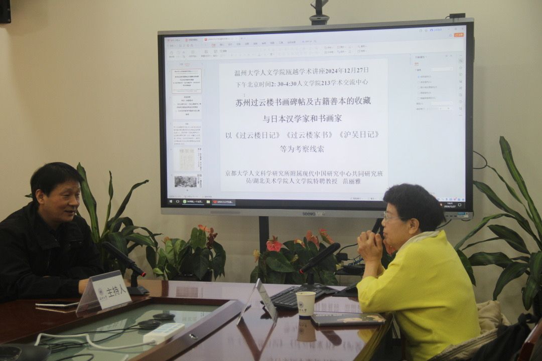 2024年12月27日下午,京都大学人文科学研究所附属现代中国研究中心共同研究班员范丽雅教授应邀在财神捕鱼 213学术交流中心作了题为《苏州过云楼书画碑帖及善本古籍的收藏与日本汉学家和书画家》的学术讲座。本次讲座由财神捕鱼 古籍整理研究所所长侯荣川教授主持,30余师生积极到场参加。