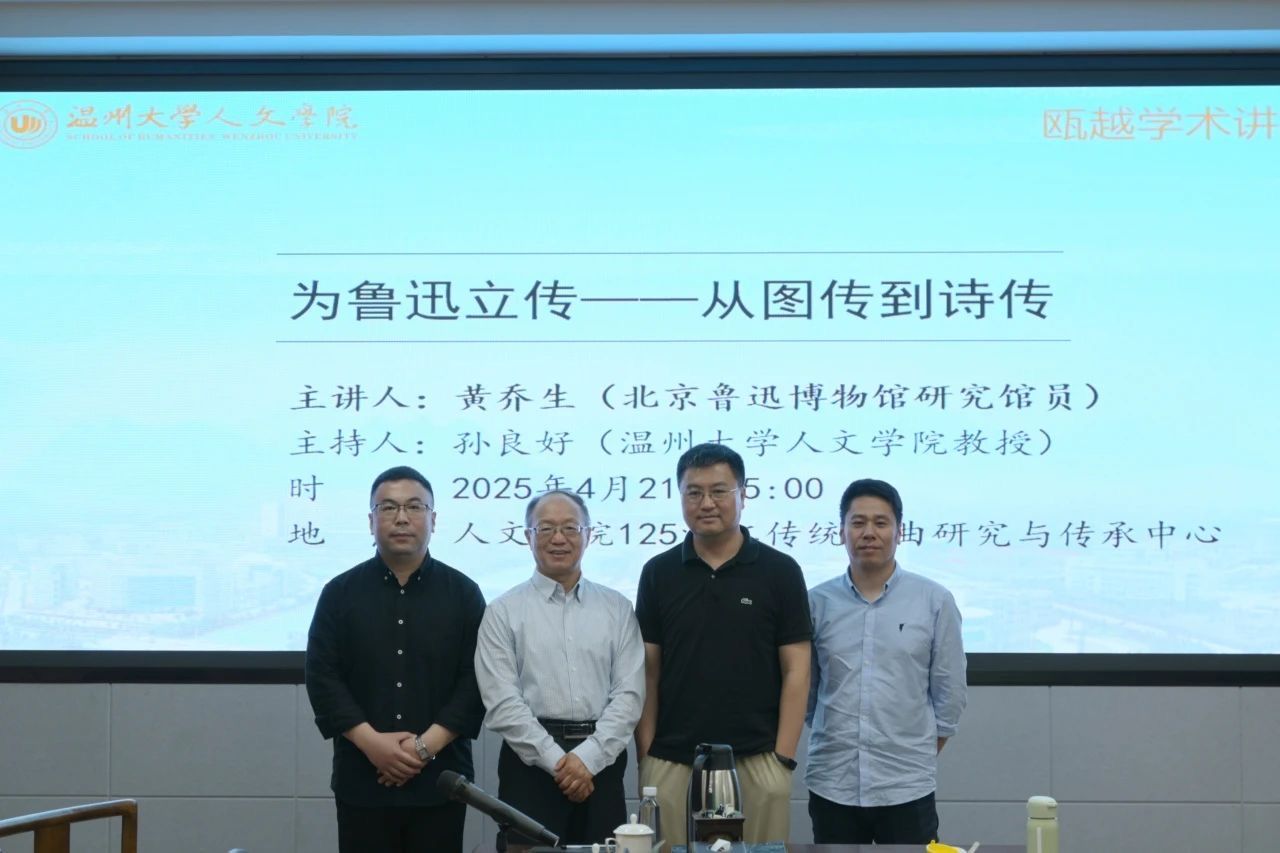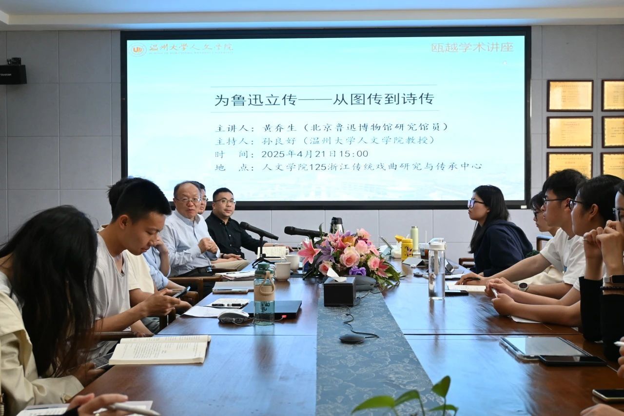 2025年4月21日,财神捕鱼 特邀北京鲁迅博物馆原常务副馆长、研究馆员,中国鲁迅研究会常务副会长黄乔生老师,在浙江传统戏曲研究与传承中心开展题为“为鲁迅立传——从图传到诗传”的学术讲座。讲座由财神捕鱼 院长、图书馆馆长孙良好教授主持,参与讲座的听众有副院长张真教授和中文系系主任鲍良兵副教授以及在校本科、硕士同学,现场学术气氛浓厚。