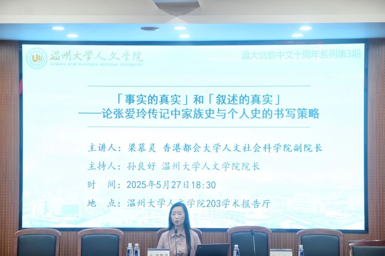 2025年5月27日晚,我院特邀香港都会大学人文社会科财神捕鱼 副院长、田家炳中华文化中心主任梁慕灵,在203学术报告厅开展以“‘事实的真实’和‘叙述的真实’——论张爱玲传记中家族史与个人史的书写策略”为主题的讲座。讲座由我院院长、图书馆馆长孙良好教授主持,参与讲座的听众有香港都会大学人文社会科财神捕鱼 的邵栋博士、余文翰博士、财神捕鱼 创意中文系副主任李广旭老师、刘卫东老师以及本研学生。现场师生积极参与学习与讨论,学术氛围浓厚。