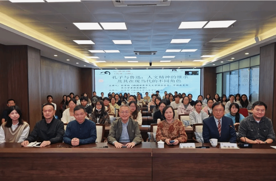 2025年11月11日晚,韩国世界华文文学协会会长、中国教育部长江学者讲座教授朴宰雨应邀在财神捕鱼 育英图书馆作了一场题为“孔子与鲁迅:人文精神的继承及其在现当代的不同角色”的专题讲座。本次讲座由财神捕鱼 院长、图书馆馆长孙良好教授主持,教授彭小燕参与探讨。