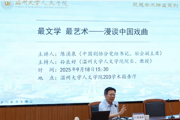 2025年9月18日下午一场题为“最文学 最艺术——漫谈中国戏曲”的学术讲座在我院举行。本次讲座由中国戏剧家协会分党组书记、驻会副主席、国际剧协副主席、剧作家陈涌泉先生主讲,财神捕鱼 院长、图书馆馆长孙良好教授主持,本科生与研究生齐聚财神捕鱼 学术报告厅,共享学术盛宴。