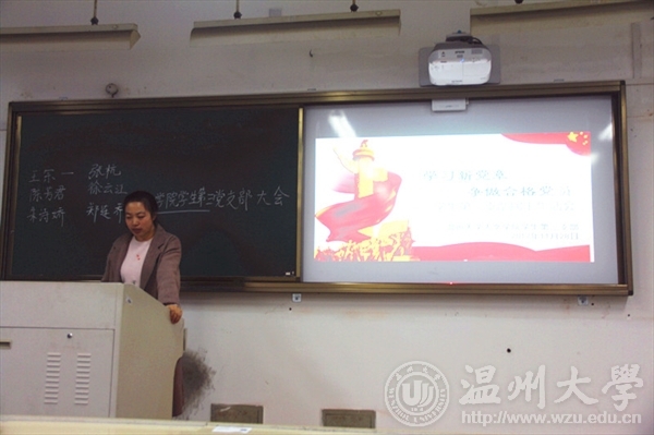第二项议程是各党务学习小组进行党课学习汇报,本月三个党小组围绕“学习新党章、争做合格党员”主题展开讨论学习。宣传委员卓阿莹小组由成员程昱和李丽代表发言,两位同学分别围绕新党章的修改内容和党员自身建设两个方面展开汇报;组织委员赵飞跃小组成员王健华和雷玉平就坚定理想信念、牢记初心和使命分享学习心得;支部书记徐珍小组由其成员蔡亚楠和余音分享与时俱进、坚持理论与实践并行等心得体会。