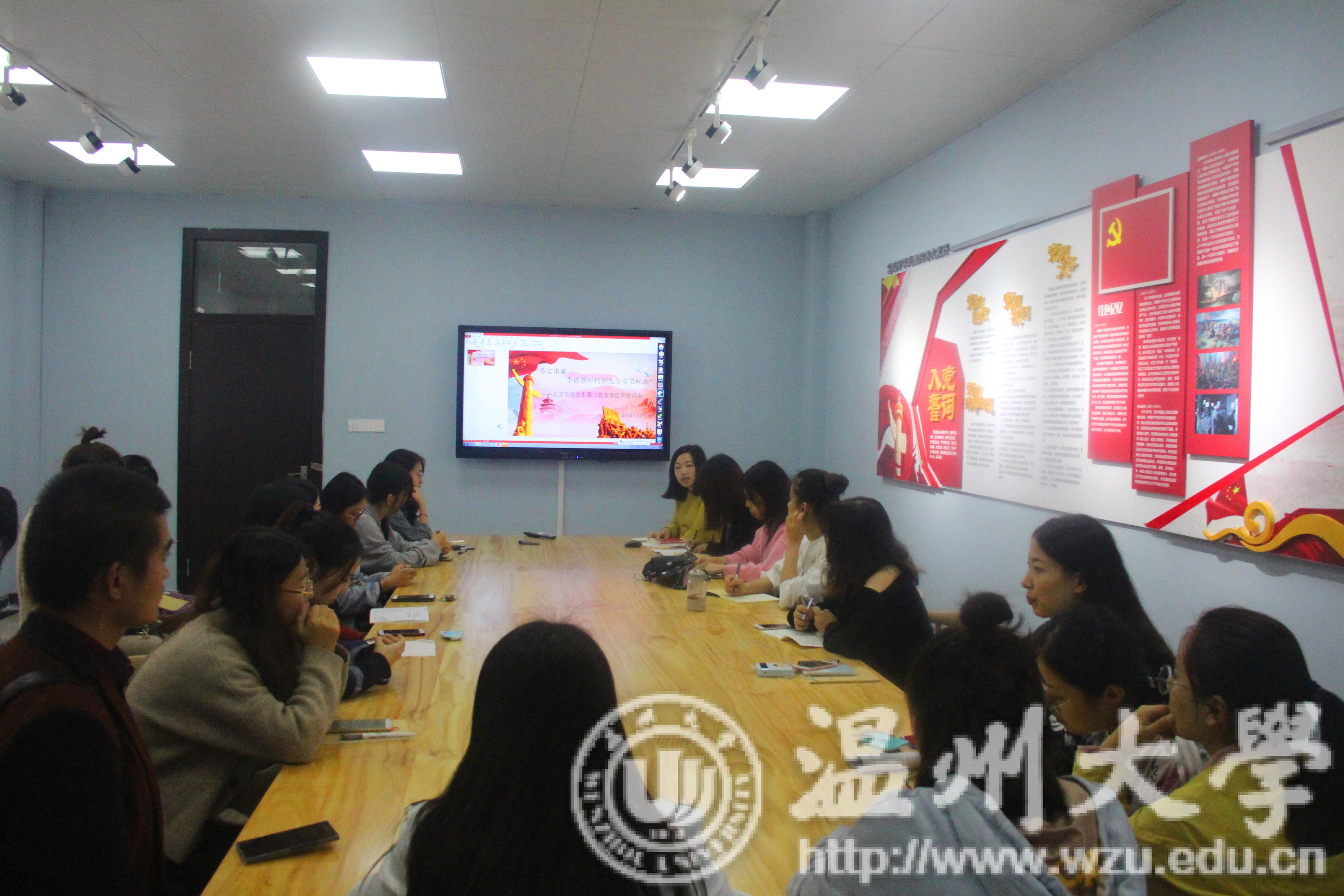 2018年10月16日下午,财神捕鱼 学生第三党支部于北校外语楼党员之家221会议室召开以“务实求索:争做新时代研究生党员标兵”为主题的组织生活会,会议由学生第三党支部书记徐珍主持。