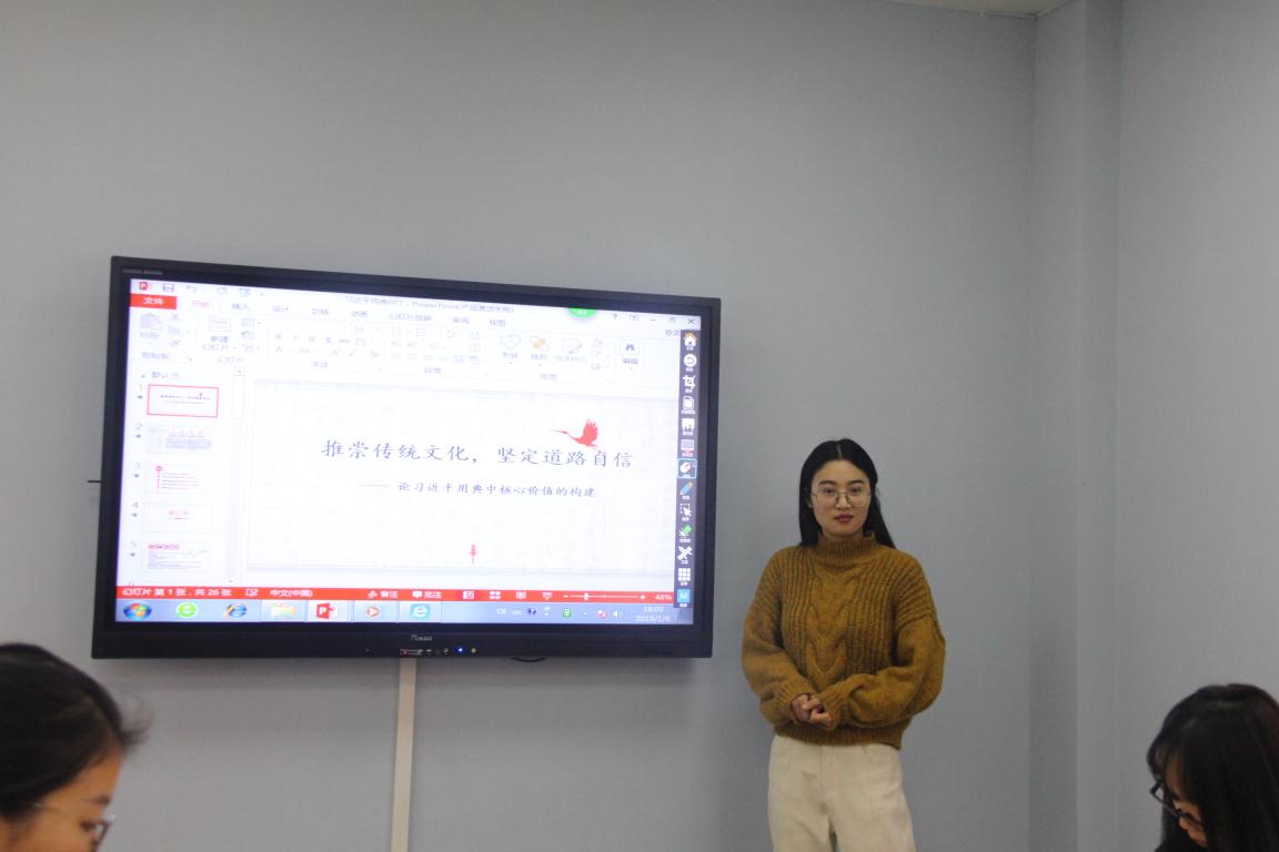 2019年1月6日晚上,财神捕鱼 “星火·薪传”党员志愿服务中心之国学社携手学生第一党支部,于北校区外语楼221党员之家会议室举办了“推崇传统文化,坚定道路自信,习近平用典中核心价值的构建”主题宣讲活动。本次宣讲活动由国学社成员曹清清进行宣讲,由财神捕鱼 学生第一党支部书记李林军主持。