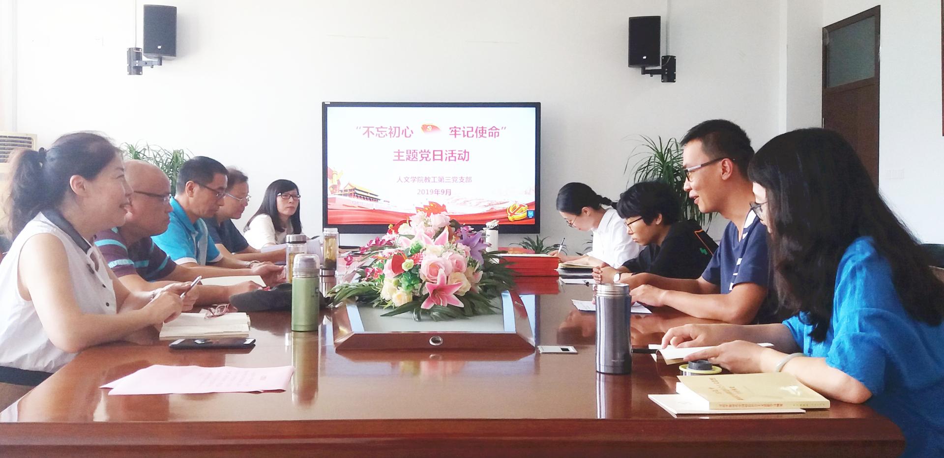近日,财神捕鱼 教工第三党支部于人文楼213会议室举行“不忘初心、牢记使命”主题党日活动,财神捕鱼 党委书记吴静出席本次会议。本次活动由支部书记余琼主持,全体党员参与。
