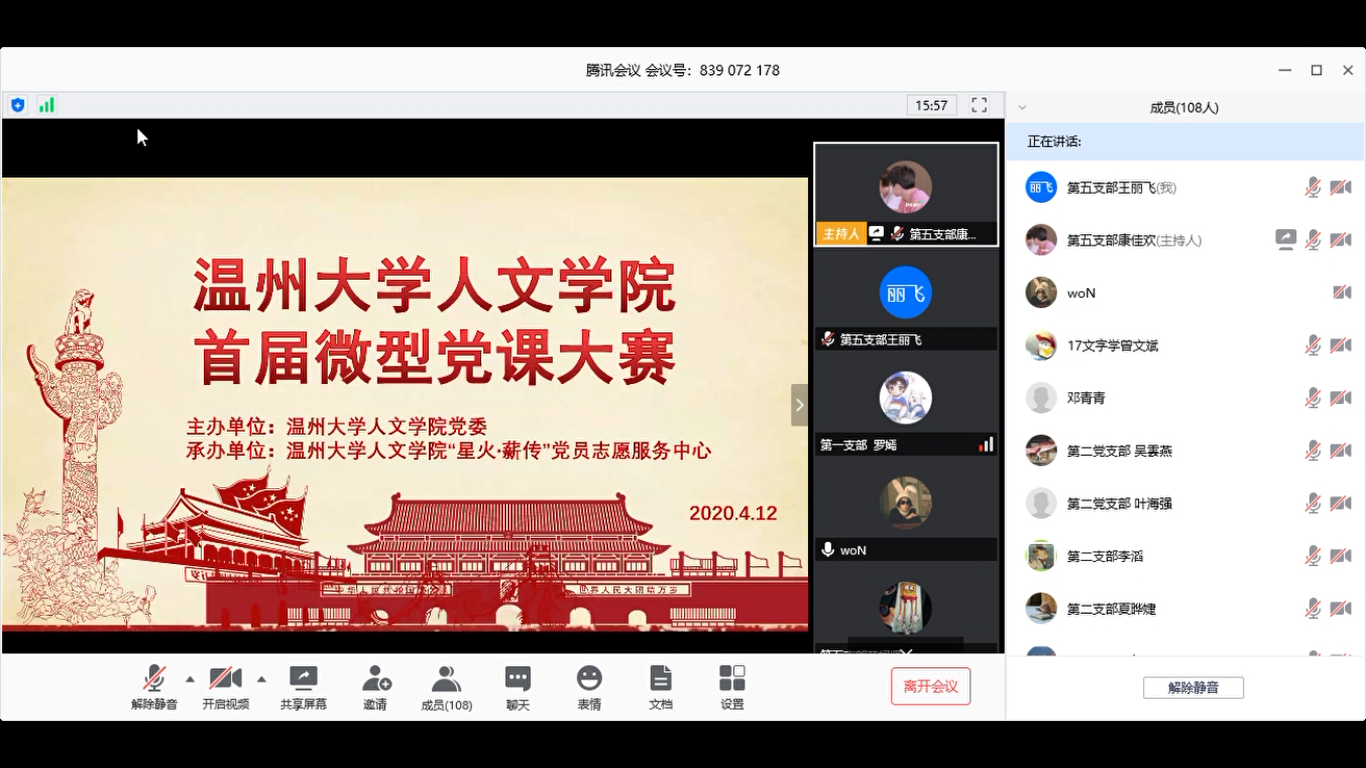 4月12日晚18:30,财神捕鱼 首届学生微型党课大赛在线上举行。财神捕鱼 党委副书记魏一老师、辅导员胡震鹏老师、申业磊老师和李丹萍老师担任本次比赛评委,财神捕鱼 全体学生党员在线上观看比赛。