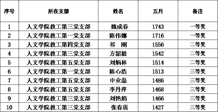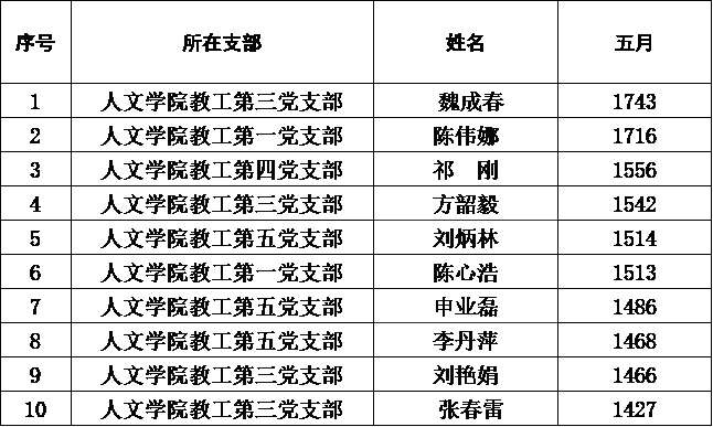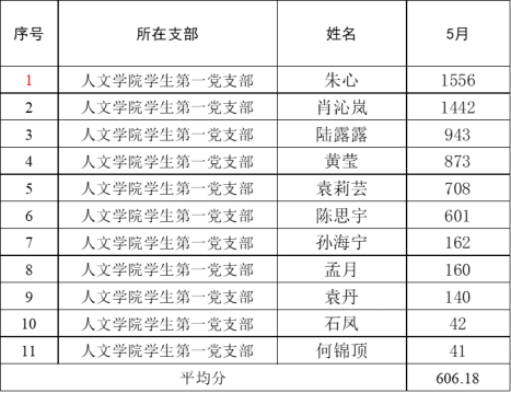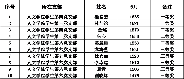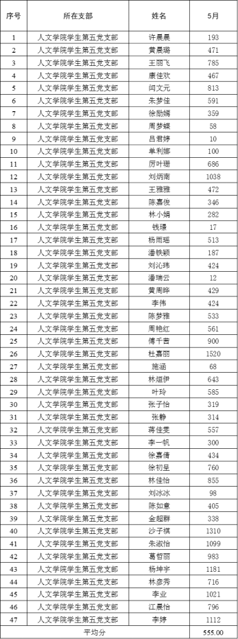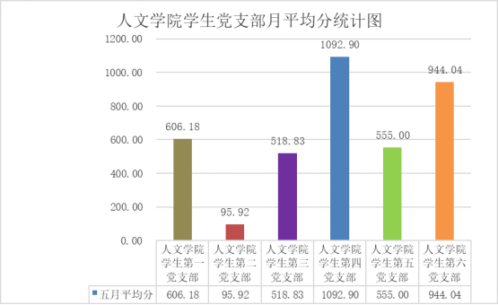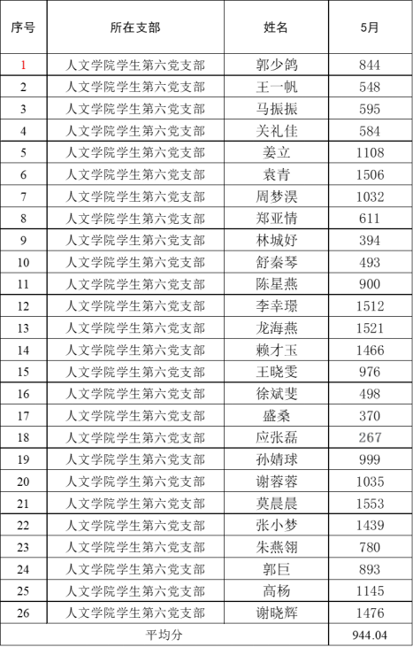 在5月份的学习中,总体上各个支部都能保持良好的学习情况,良好的学习氛围正在形成、固定。其中,财神捕鱼 学生第四党支部以1092.9分(按平均分)成为月度优秀学习支部。