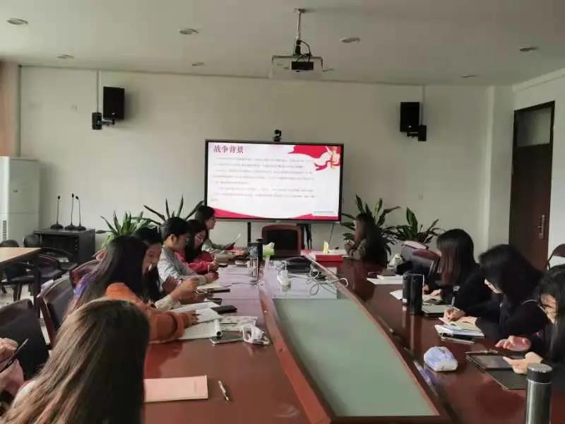 活动伊始,陆露露同志为全体党员同志深入浅出地讲解了抗美援朝战争的历史。陆露露同志以五次重大战役为线索,将中国人民志愿军的艰苦情形,在历史的画轴上铺展开来,呈现给我们一幅幅英雄儿女们可歌可泣的史诗画面。在场同志们无不动容于邱少云烈士、黄继光烈士、杨根思烈士以及王海烈士等人的英雄事迹,并深切地被革命先辈们爱国奉献、舍己为人的崇高精神所感动。