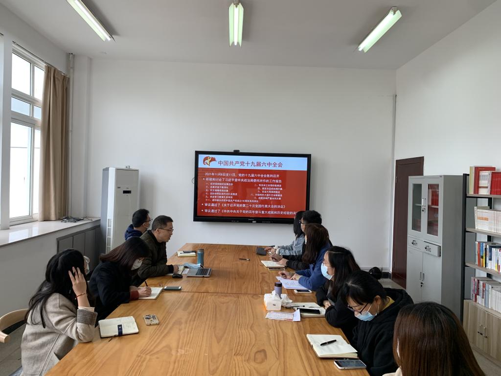 会上首先讨论了支部预备党员沈蝶同志的转正问题。根据党员转正程序,沈蝶同志汇报预备期政治思想、工作生活等方面情况,与会正式党员分别对沈蝶同志预备期表现和能否按期转正做了说明和表态,支部组织委员谭黄同志代表支委会汇报支部对沈蝶同志预备期的教育考察情况。经举手投票表决,与会正式党员一致同意沈蝶同志按期转正。随后,党支部书记魏一从深刻领会第三个历史决议的战略考量、主要内容以及新时代新征程展现新作为要求三个方面切入,详细解读了党的十九届六中全会精神。党员同志们就十九届六中全会精神内容分享所思所悟。