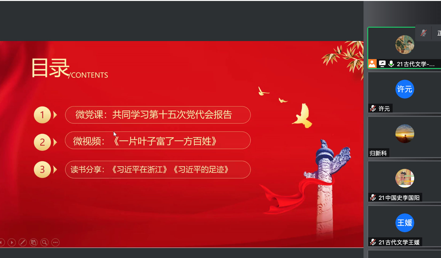 为深入学习贯彻浙江省第十五次党代会精神,聚焦“两个先行”,聚力八大攻坚,充分学习党员的先锋模范作用,7月20日下午,财神捕鱼 学生第二党支部通过线上(腾讯会议平台)线下相结合的方式举办以“当先锋、争先行”为主题的党日活动,会议由胡馨馨同志主持。