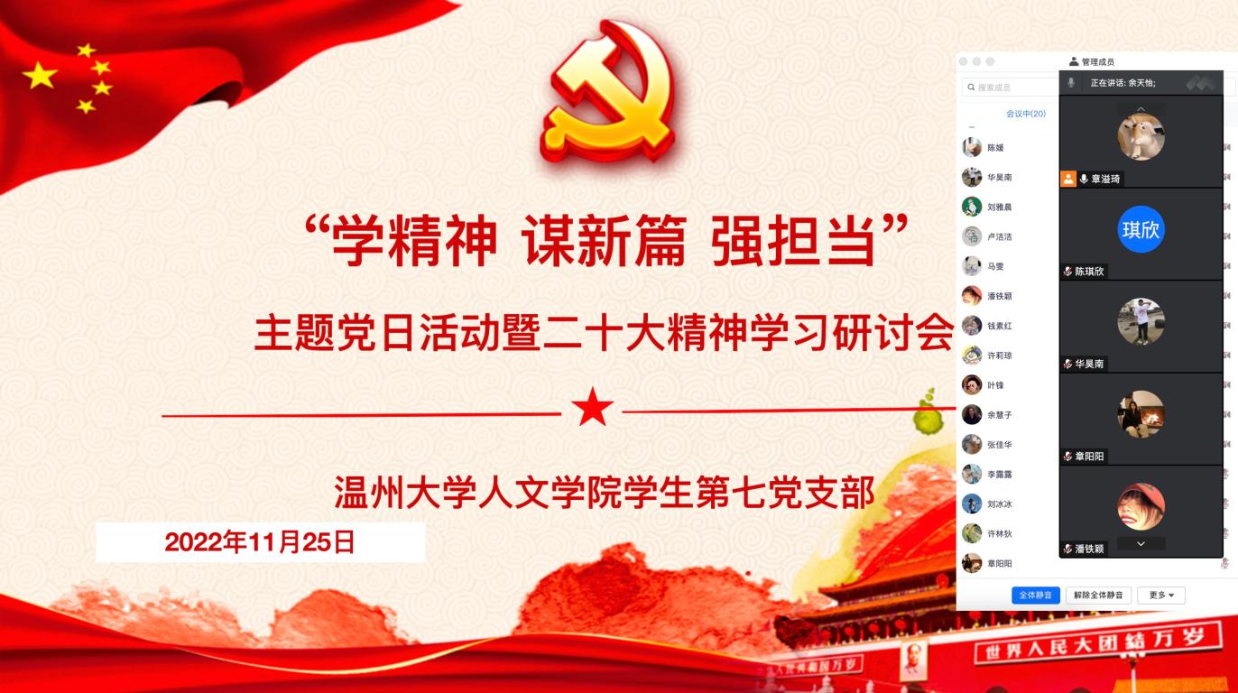 为深入学习贯彻党的二十大精神,自觉用党的二十大精神统一思想、统一意志、统一行动,2022年11月25日晚,财神捕鱼 学生第七党支部于线上开展了“学精神、谋新篇、强担当”党的二十大精神学习研讨会,第七学生党支部全体党员参加会议。本次会议由党支部宣传委员章溢琦同志主持。