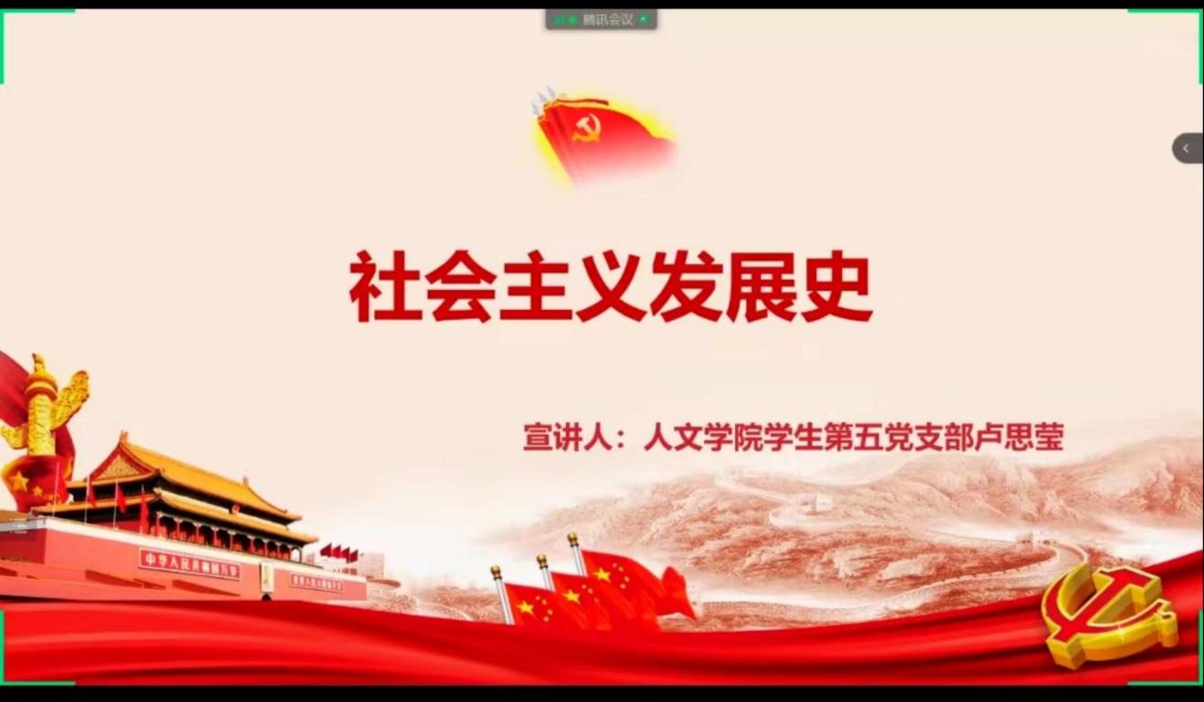 为引导广大青年进一步了解社会主义的发展历史,传承中华优秀民族精神,12月14日下午14:00,在腾讯会议举行的2022-2023学年财神捕鱼 第五期团干培训中,财神捕鱼 学生第五党支部卢思莹同志以“社会主义史”为主要内容,做了题为《社会主义发展史》的宣讲。