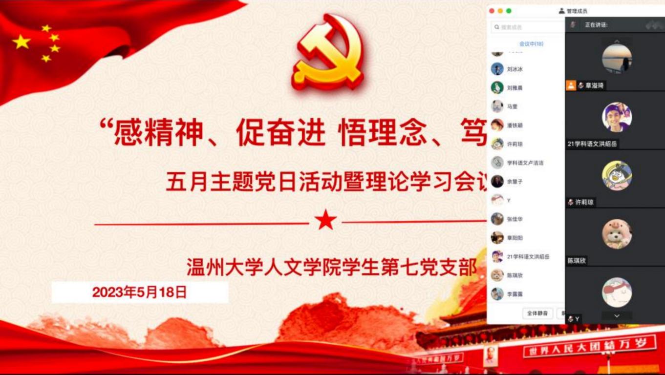 为深入学习贯彻习近平总书记关于青年工作的重要思想,进一步激励青年党员坚定不移听党话、跟党走;学习、领会省委书记易炼红给财神捕鱼 重要回信精神,以及省委常委、市委书记刘小涛在财神捕鱼 办学90周年纪念大会上的讲话精神。2023年5月18日晚,财神捕鱼 学生第七党支部于线上开展了“感精神、促奋进 悟理念、笃行之”主题党日活动暨理论学习会。会议主要包括“读回信”“悟思想”“观视频”“学精神”等四个环节,全体党员参加。