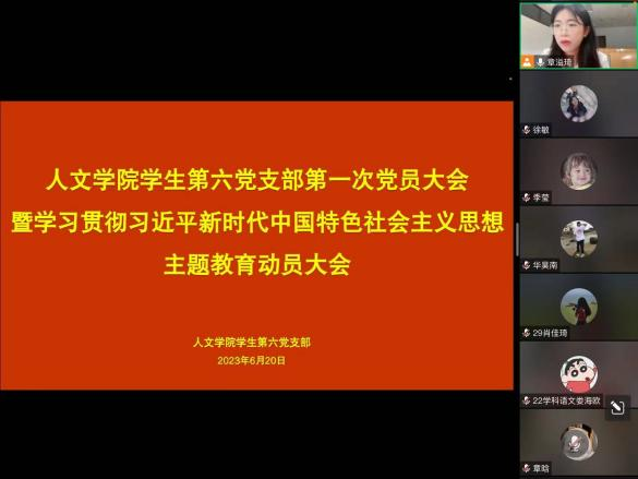 为深入推进习近平新时代中国特色社会主义思想主题教育,顺利开展中共财神捕鱼 学生第六党支部党建工作,2023年6月20日晚,财神捕鱼 学生第六党支部于线上召开了第一次党员大会暨学习贯彻习近平新时代中国特色社会主义思想主题教育动员大会,第六学生党支部全体党员参加会议。本次会议由党支部书记章溢琦同志主持。