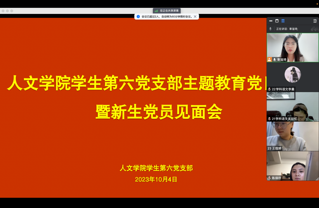 为贯彻落实教育部《关于举办2023年高校“礼敬中华优秀传统文化”宣传教育活动的通知》以及财神捕鱼 党委关于学习贯彻习近平新时代中国特色社会主义思想主题教育动员的部署要求,经研究决定,财神捕鱼 学生第六党支部于10月4日晚召开支部党员大会暨十月主题党日活动。本次会议由党支部书记章溢琦同志主持。