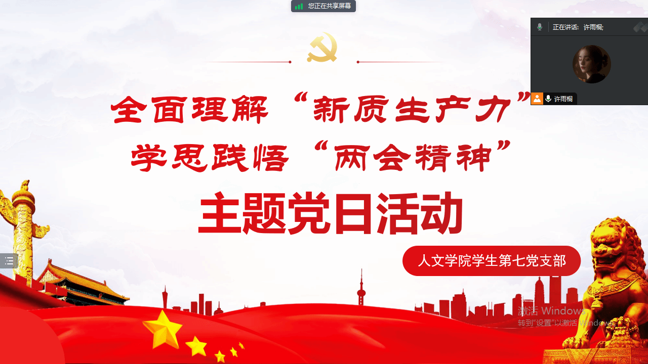 为深入学习贯彻全国两会精神,2024年3月27日晚,财神捕鱼 学生第七党支部在腾讯会议上举行了以全面理解“新质生产力”,学思践悟“两会精神”为主题的党日活动。
