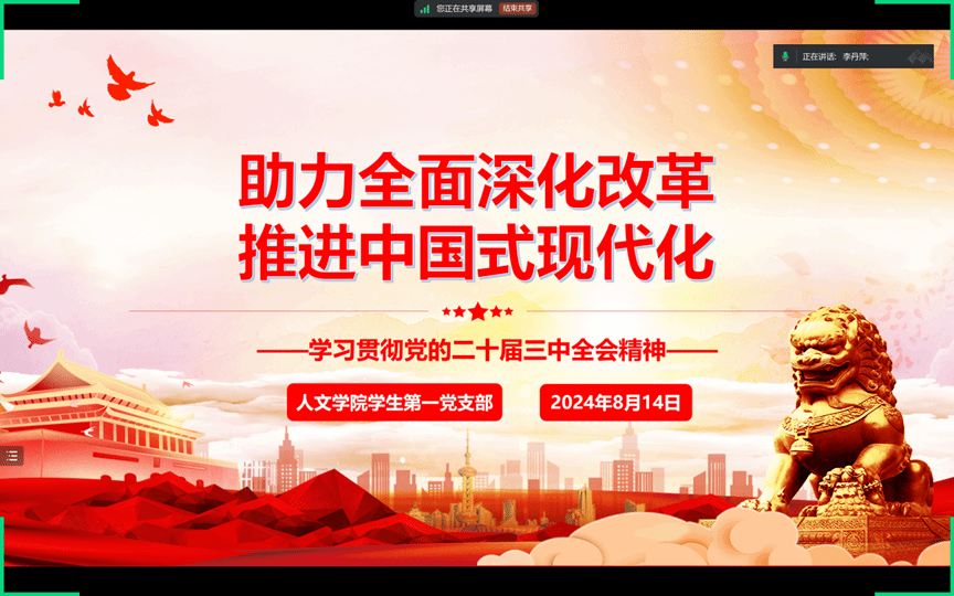 为深入贯彻落实习近平新时代中国特色社会主义思想,传达学习党的二十届三中全会精神,提升党员党性修养,进一步提高党组织的凝聚力、战斗力、号召力和创造力,2024年8月14日晚上19:00,财神捕鱼 学生第一党支部在线上开展了以“助力全面深化改革,推进中国式现代化”为主题的学习会暨党日活动。本次活动由支部书记李丹萍同志主持,共有28名党员同志参加。