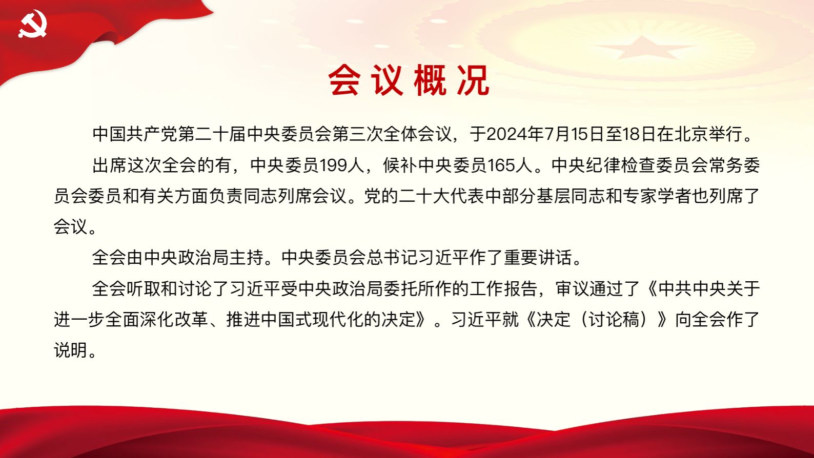会议指出,党的二十届三中全会是在以中国式现代化全面推进强国建设、民族复兴历史伟业的关键时刻召开的一次十分重要的会议,具有重大而深远的意义。支部全体党员要进一步提高思想自觉,深刻认识党的二十届三中全会的重大意义,深刻领会和把握新时代新征程进一步全面深化改革的重大原则、目标要求和重点任务,积极主动将全会精神转化为实际行动,切实做到学深悟透、知行合一。