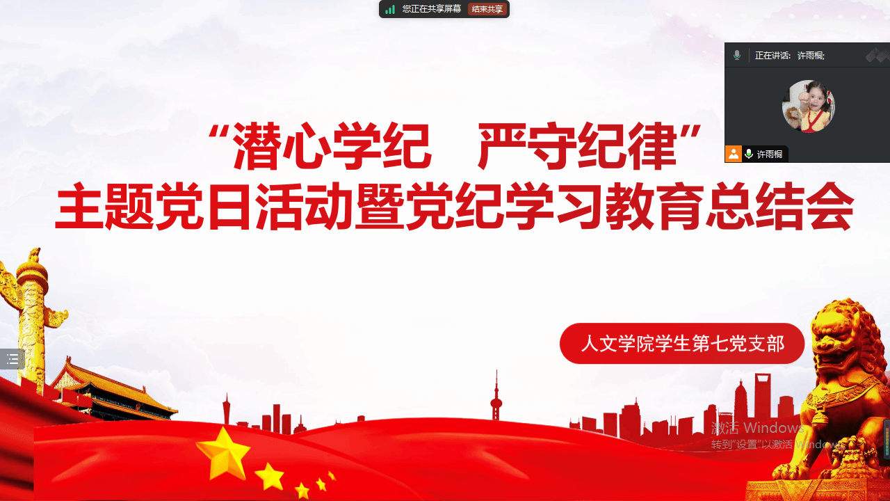 为深化“循迹溯源学思想促践行”行动,深入学习习近平总书记关于党纪学习教育的重要讲话和重要指示精神,推进党纪学习教育走深走实,取得实实在在的成效,2024年9月11日晚,财神捕鱼 学生第七党支部在线上开展了以“潜心学纪 严守纪律”为主题的党日活动。会议由支部宣传委员许雨桐主持。