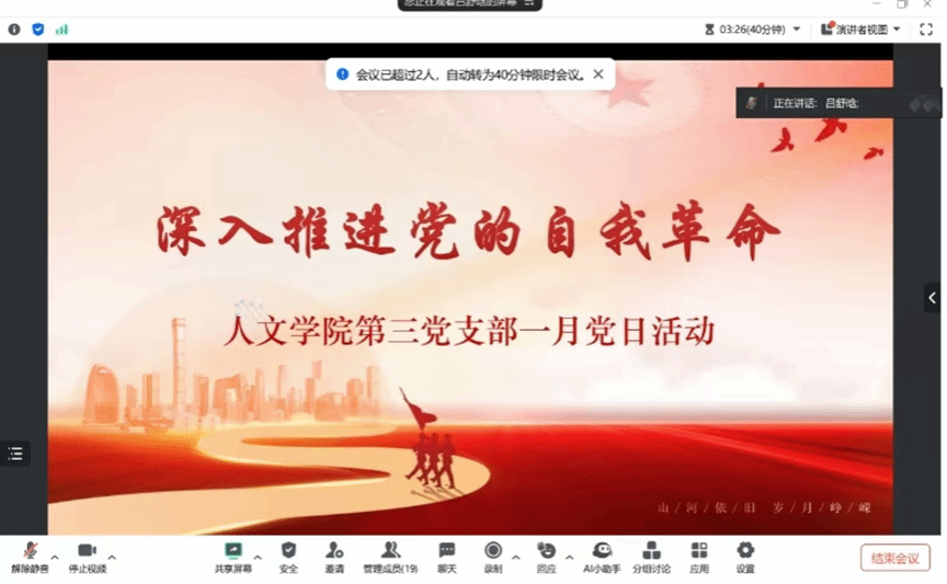 为积极响应党的号召,深入学习贯彻习近平总书记关于党的自我革命的重要思想,2025年1月17日晚上,财神捕鱼 学生第三党支部在线上开展了“深入推进党的自我革命”主题党日活动。本次活动由吕舒晗同志和陈嘉乐同志主持。