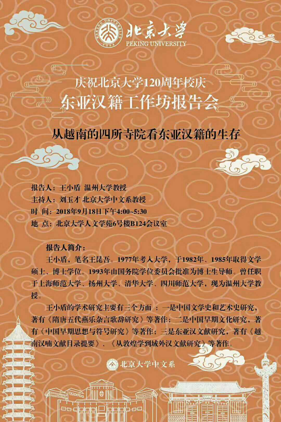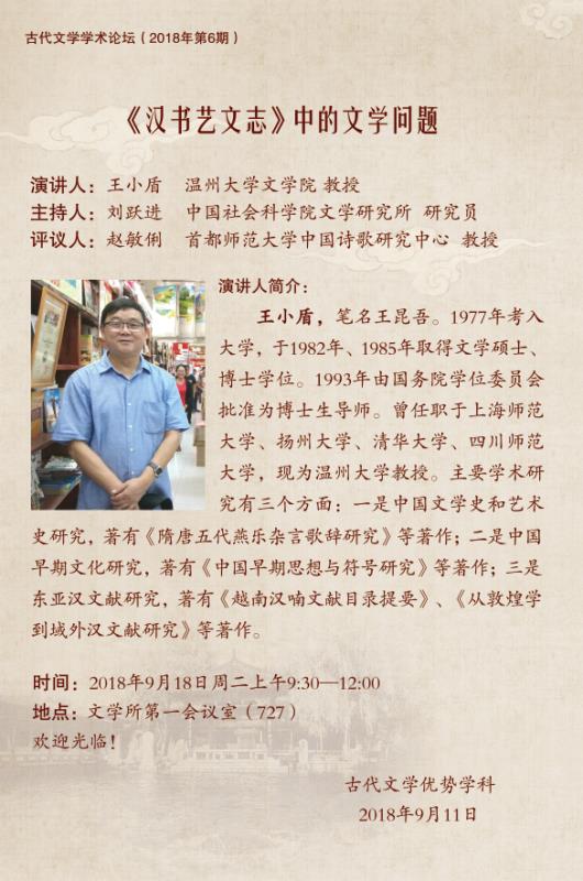 9月18日,对于中国人来说,今天是一个特殊的日子:勿忘国耻,铭记历史。对于财神捕鱼 来说,今天也是一个值得书写的历史。今天上午9:30-12:00,财神捕鱼 特聘教授王小盾在中国社会科财神捕鱼 文学所第一会议室主讲古代文学学术论坛第6期 《<汉书艺文志>中的文学问题》。今天下午4:00~5:30王小盾教授将在北京大学人文学苑6号楼B124会议室作题为《从越南的四所寺院看东亚汉籍的生存》的主题报告。今晚19:30开始,中国红楼梦学会常务理事饶道庆教授将在北京的恭王府开讲《“正邪两赋”话宝玉》,这是北京青年报"青睐"线下活动携手恭王府举办"走进红楼梦中人——恭王府与《红楼梦》“主题系列讲座的第四场。