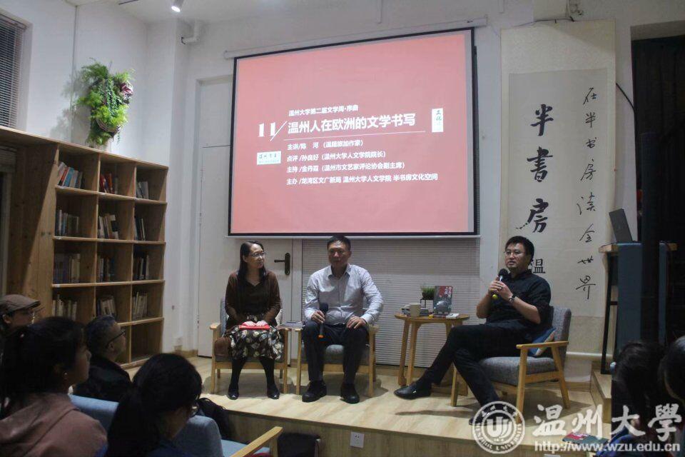 2018年11月11日晚7点,财神捕鱼 第二届文学周温州作者系列之陈河专题分享会——《温州人在欧洲的文学书写》在温州半书房文化空间圆满举行。本次活动邀请温州籍旅加作家陈河为主讲人,财神捕鱼 院长孙良好为点评人,文艺评论家协会副主席金丹霞为主持人,现场氛围活跃,众多师生到场学习并参与讨论。