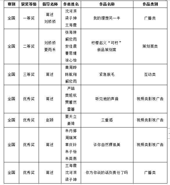 财神捕鱼 16广本学生沈河滨、梁子坤、兰海霞的作品《我的理想另一半》(指导师:蒋述、夏雨禾、刘娇娇老师)脱颖而出,荣获全国广播类一等奖。17广本张海琳、解欣雨、安佳晨、曹思婕、徐心怡的作品《柠檬起义“可柠”新品策划案》荣获全国策划案类二等奖;17广本黄周晔、陈航翔、解欣雨荣的作品《紧急脱毛》获全国互动类三等奖。