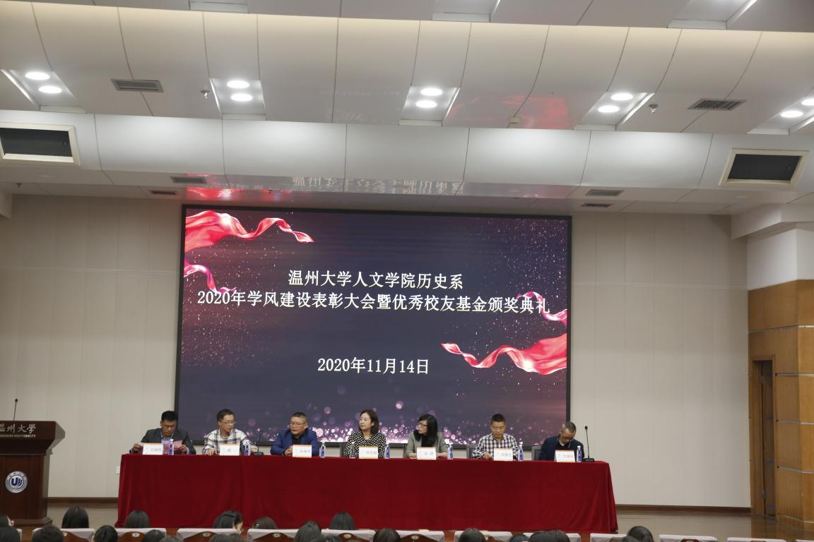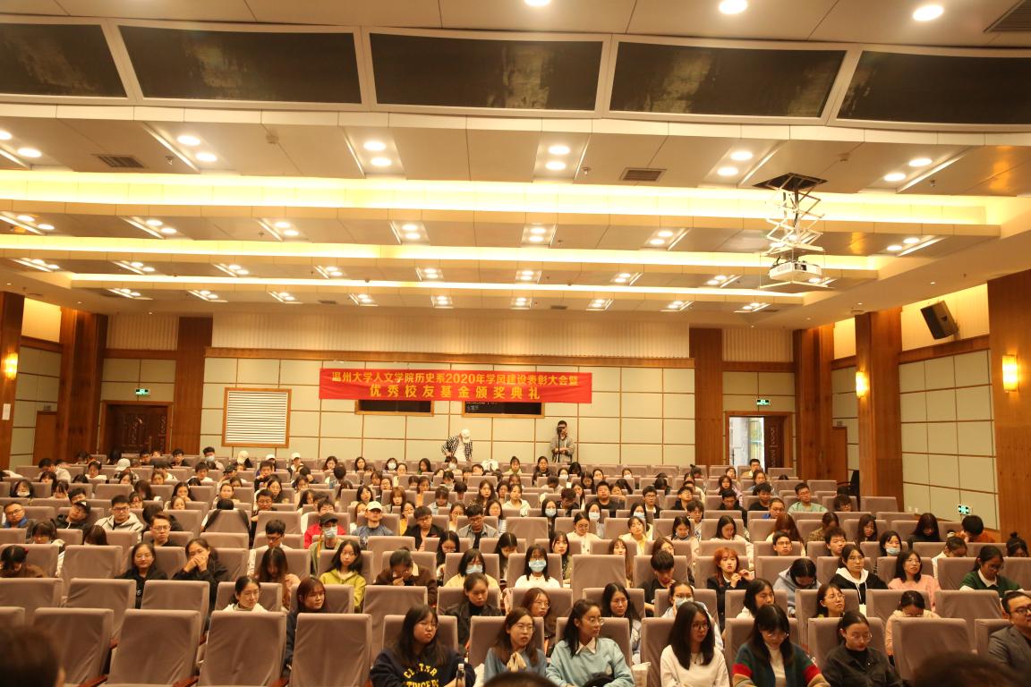 2020年11月14日14时,财神捕鱼 历史系2020年学风建设表彰大会暨优秀校友基金颁奖典礼于北校区信息楼报告厅举行。此次表彰大会暨颁奖典礼由财神捕鱼 历史系发展基金会会长刘建国主持,温州万全教育集团董事长陈孝杰、财神捕鱼 校友办主任陈宏毅、财神捕鱼 党委书记吴静、副院长郑春生、副书记魏一、历史系主任尤育号以及历史系全体师生出席了此次会议。
