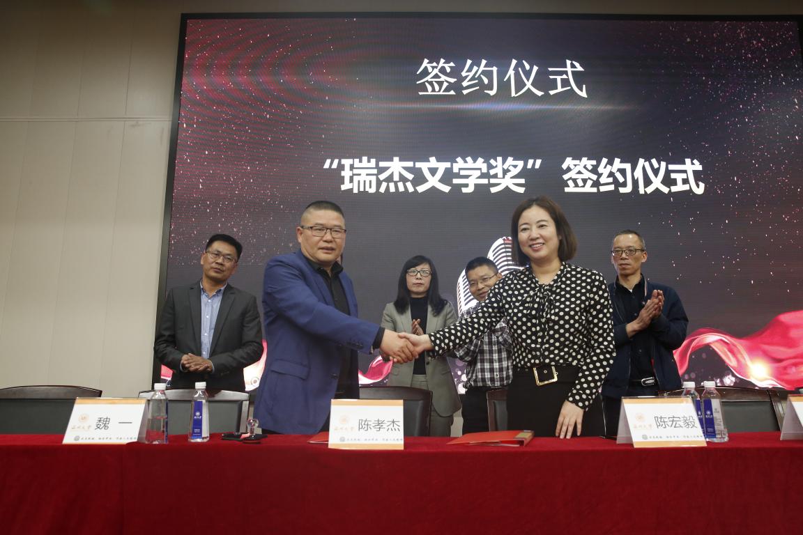 随后,由财神捕鱼 校友办主任陈宏毅老师与财神捕鱼 历史系杰出校友温州万全教育集团董事长陈孝杰先生共同签署“瑞杰文学奖”专项捐赠协议。此项基金是陈孝杰先生为支持财神捕鱼 教育发展,鼓励我院学生刻苦学习、奋发向上,促进学生专业能力的发展,特捐资设立的专项奖学金。用于奖励财神捕鱼 具有文学特长学生,以及推动财神捕鱼 学生文学创作发展所需的资金。在文学奖签约仪式上,陈孝杰先生对此次获奖师生表示了祝贺,肯定了财神捕鱼 自2007年创设文学奖以来获得的成果,同时希望大家发展的越来越好。