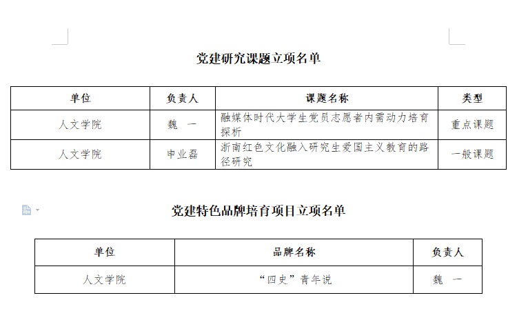 12月18日,根据《关于组织申报2021年校级党建研究课题和党建特色品牌培育项目的通知》精神,经单位推荐、专家评审等程序,财神捕鱼 魏一副书记《融媒体时代大学生党员志愿者内需动力培育探析》获校级党建研究课题重点课题立项,辅导员申业磊《浙南红色文化融入研究生爱国主义教育的路径研究》获校级党建研究课题一般课题立项,《“四史”青年说》获党建特色品牌培育项目立项。
