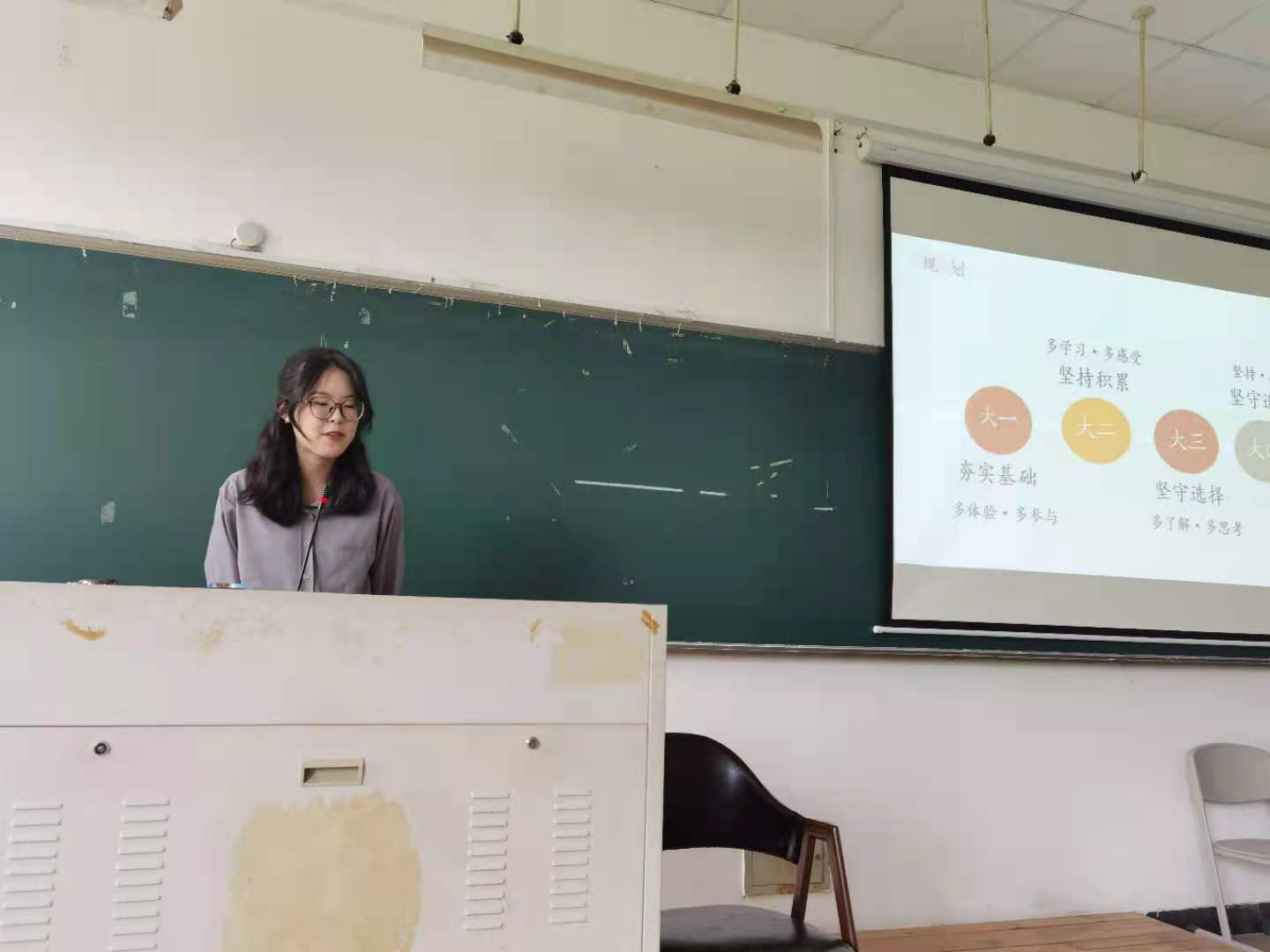 (一)周一上午9:30——11:30,在财神捕鱼 201教室,17级优秀毕业生徐婕、侯宇欣和洪苗苗为19级的学弟学妹们做了经验分享报告。